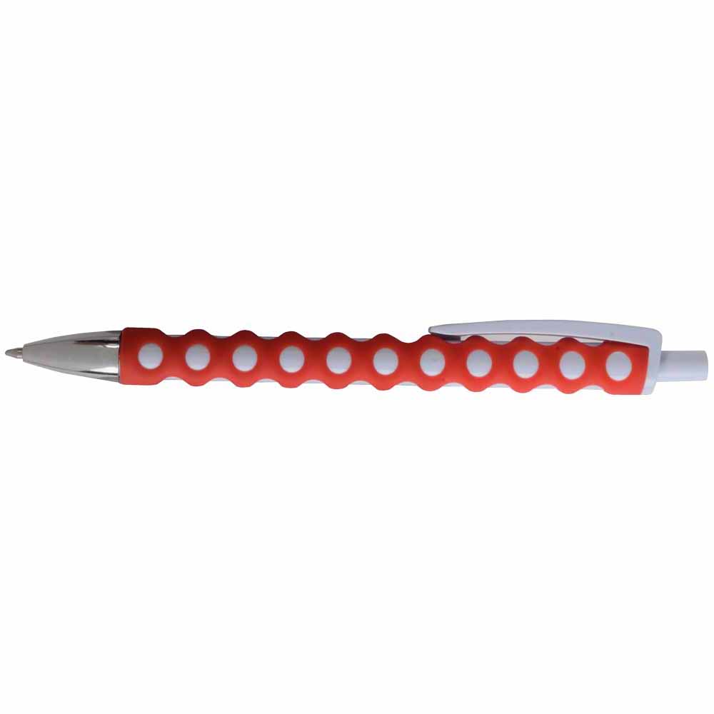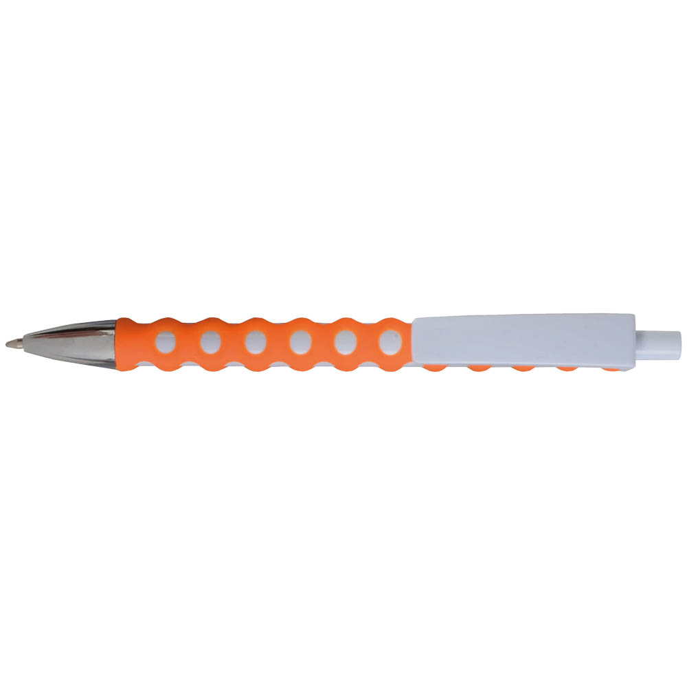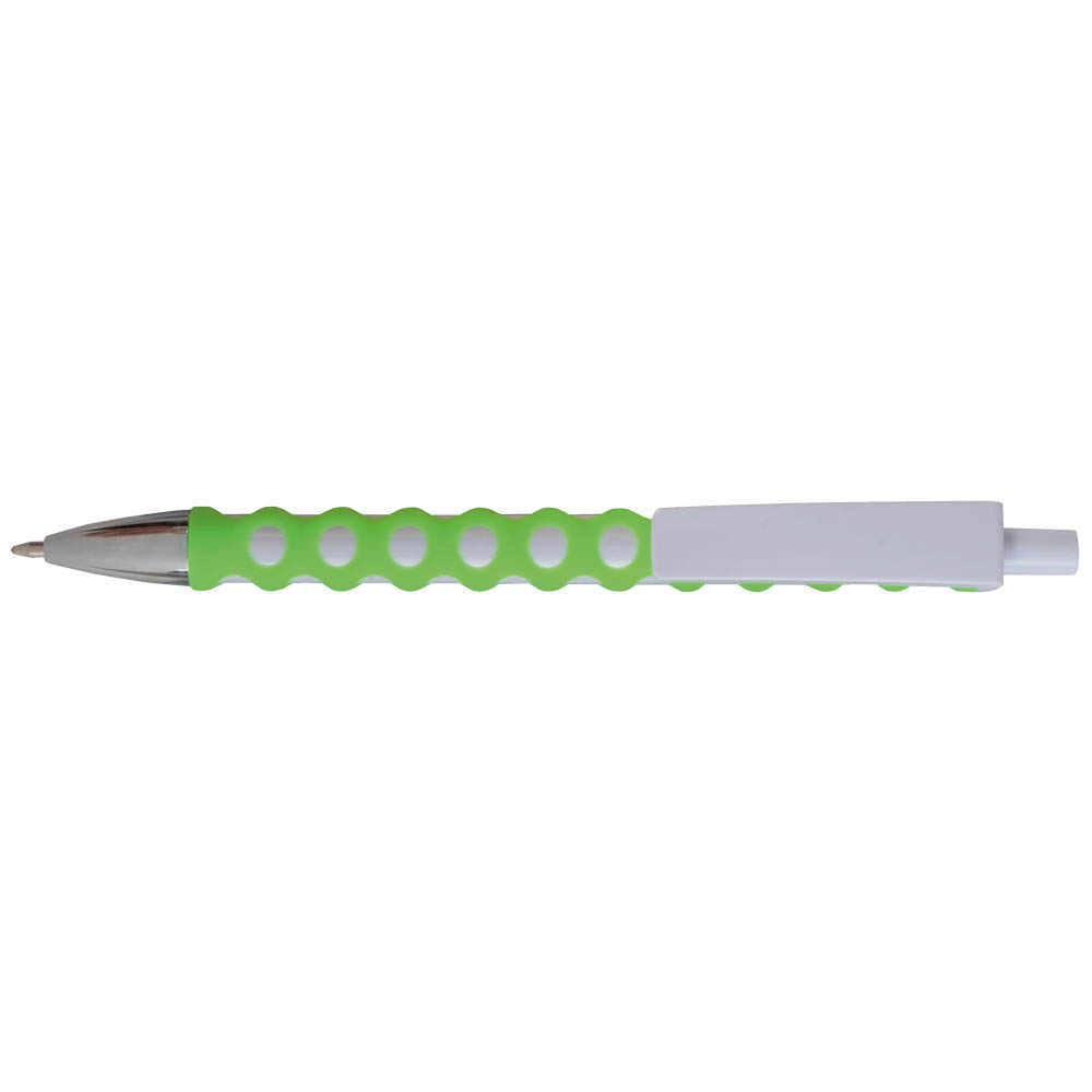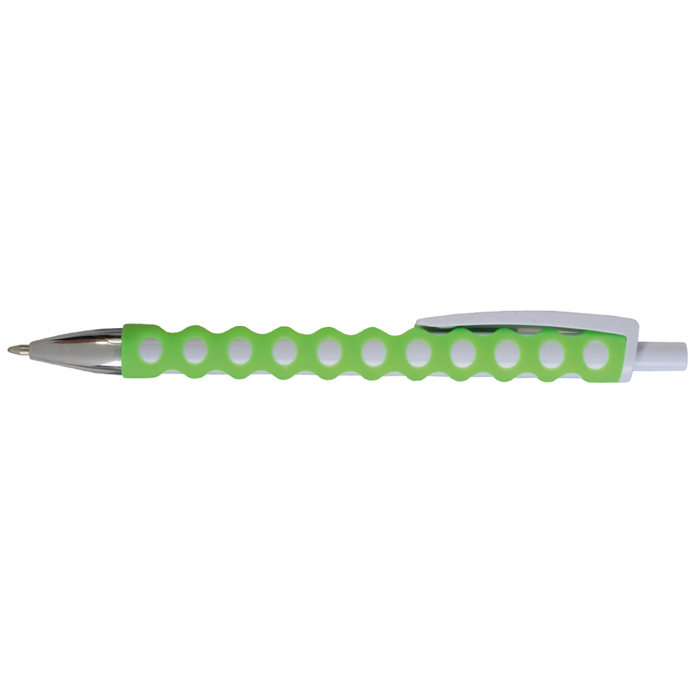 Penna a scatto in plastica con fusto, clip e pulsante bianchi, rivestimento gommato traforato colorato